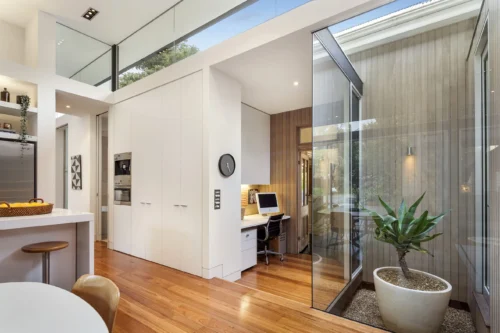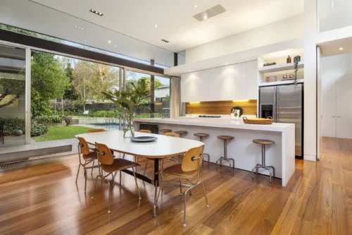 This pre-Edwardian residence has been thoughtfully reimagined through an architecturally designed extension that balances historic character with contemporary elegance. Retaining its original façade, wraparound verandah and period detailing, the home transitions into a light-filled addition defined by clean lines, generous volumes and floor-to-ceiling glazing.
