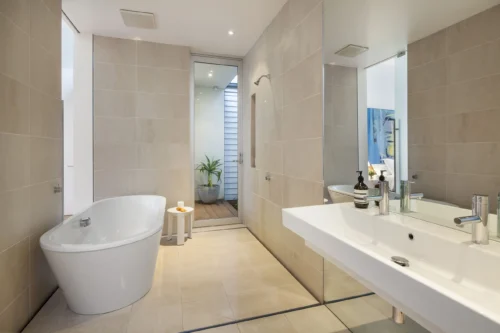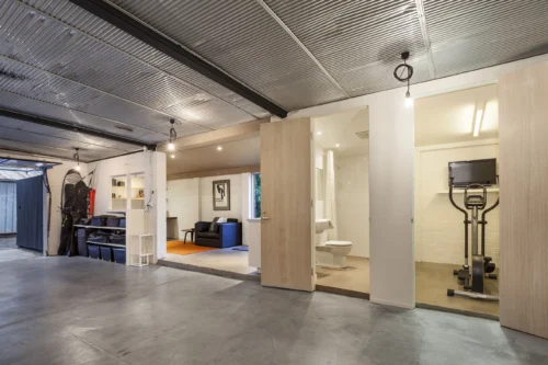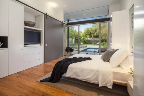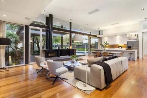 At the heart of the home is an open-plan living and dining area anchored by a streamlined kitchen, designed for both functionality and connection. The rear master suite offers a private garden retreat, while a self-contained studio above the garage provides flexibility for use as a home office, gym or guest quarters.