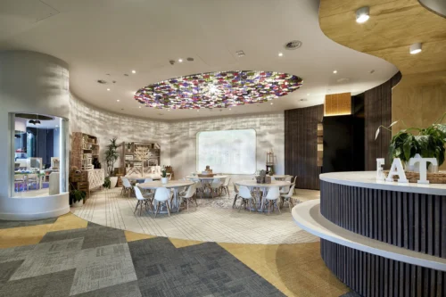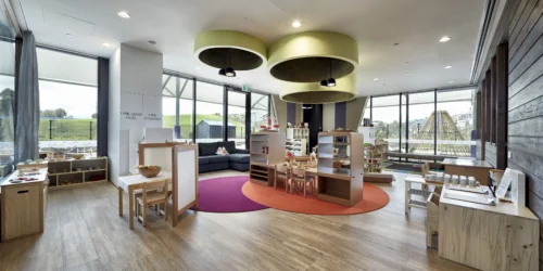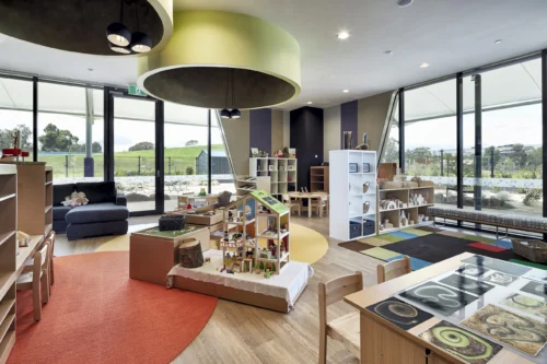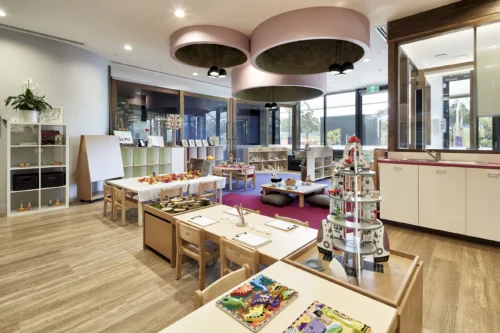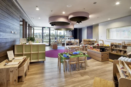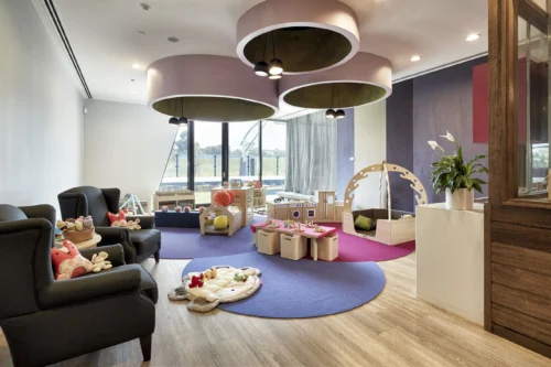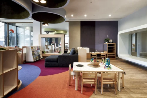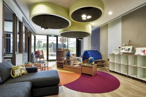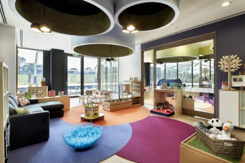A boutique fitout within Stage 2 of The Royal Children’s Hospital in Parkville, the Bambini ELC RCH Centre offers 124 places across eight purpose-built kinder rooms. Using butterflies as inspiration, each space features bright and engaging colours, with feature artwork to suit, and soft undulating forms. Each kinder room links to a central piazza, capturing the heart of Bambini in a modern, uplifting design. This central space includes an art studio and large kitchen space, encouraging creativity and skill building amongst children.