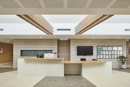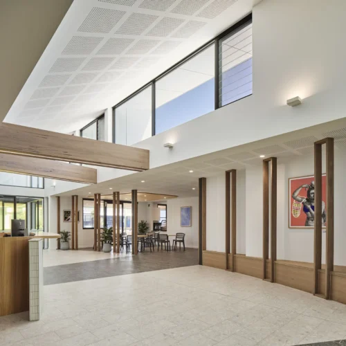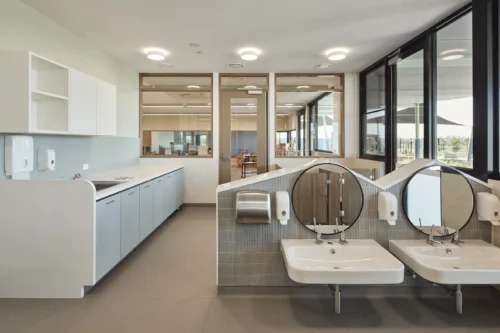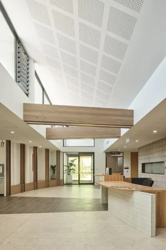 The centre’s siting was carefully considered to integrate with the surrounding urban fabric. Positioned on a prominent corner opposite a new shopping precinct and a future wetlands park, as well as adjacent to Lollypop Creek Primary School, the design responds to existing pedestrian networks and pathways, ensuring seamless connectivity between the school, community facilities, and retail spaces.
