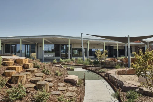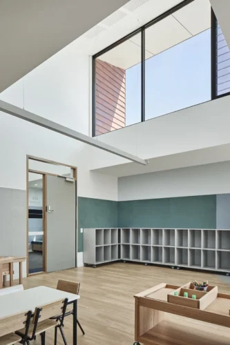 The early learning facilities include three kindergarten rooms, each accommodating 33 children, with direct connections to covered verandahs and outdoor play spaces, fostering seamless indoor-outdoor learning experiences.