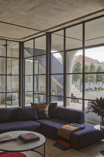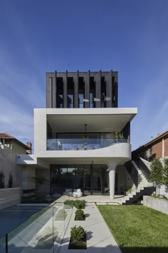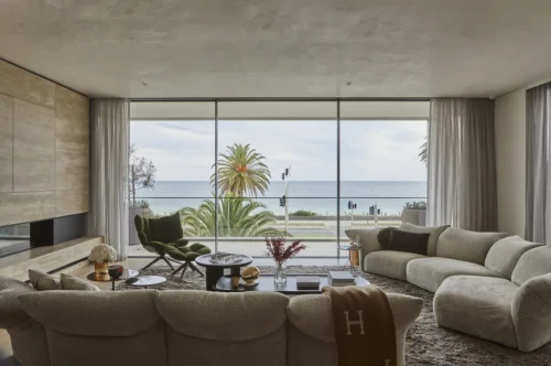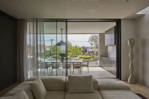 Situated along the beachfront, the Middle Park House is a three-storey family home that balances modern coastal living with refined, artisanal detailing. The design honours the site’s heritage through the thoughtful reuse of original stained-glass windows, which were carefully integrated into an otherwise contemporary new build.