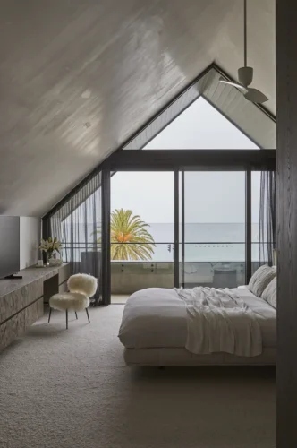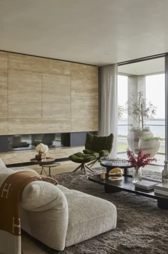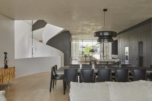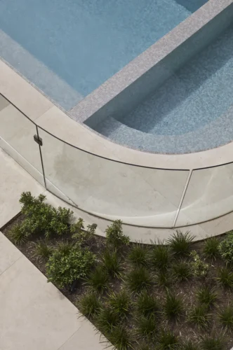 The home is arranged vertically to make the most of its compact beachfront footprint. The ground floor includes guest bedrooms, a private study, rumpus and wine room, which opens onto a secluded courtyard and pool. The first floor accommodates the main kitchen, dining, and living zones, designed for entertaining and framed by expansive views. The second floor houses the family’s primary bedrooms and private retreat spaces overlooking the best of the beachfront views.