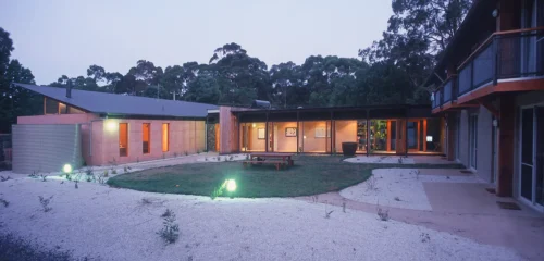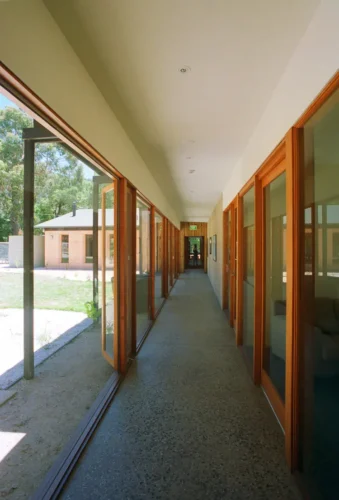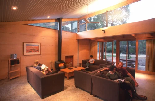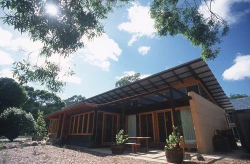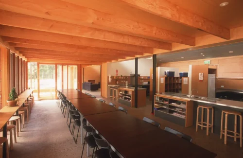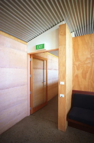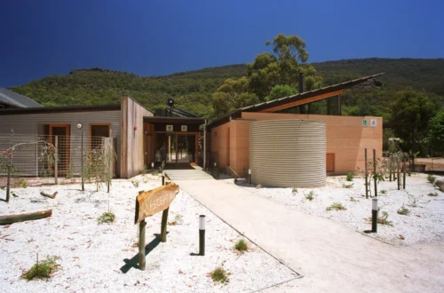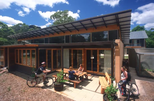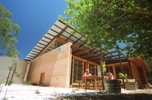Photovoltaic panels, solar hot water systems, rainwater harvesting and greywater recycling integrate with an interactive building envelope to form an instructive, environmentally conscious experience for visitors. Designed as both accommodation and environmental education hub, the hostel supports local and international travellers with shared kitchen and lounge spaces, a courtyard firepit, and edible gardens.